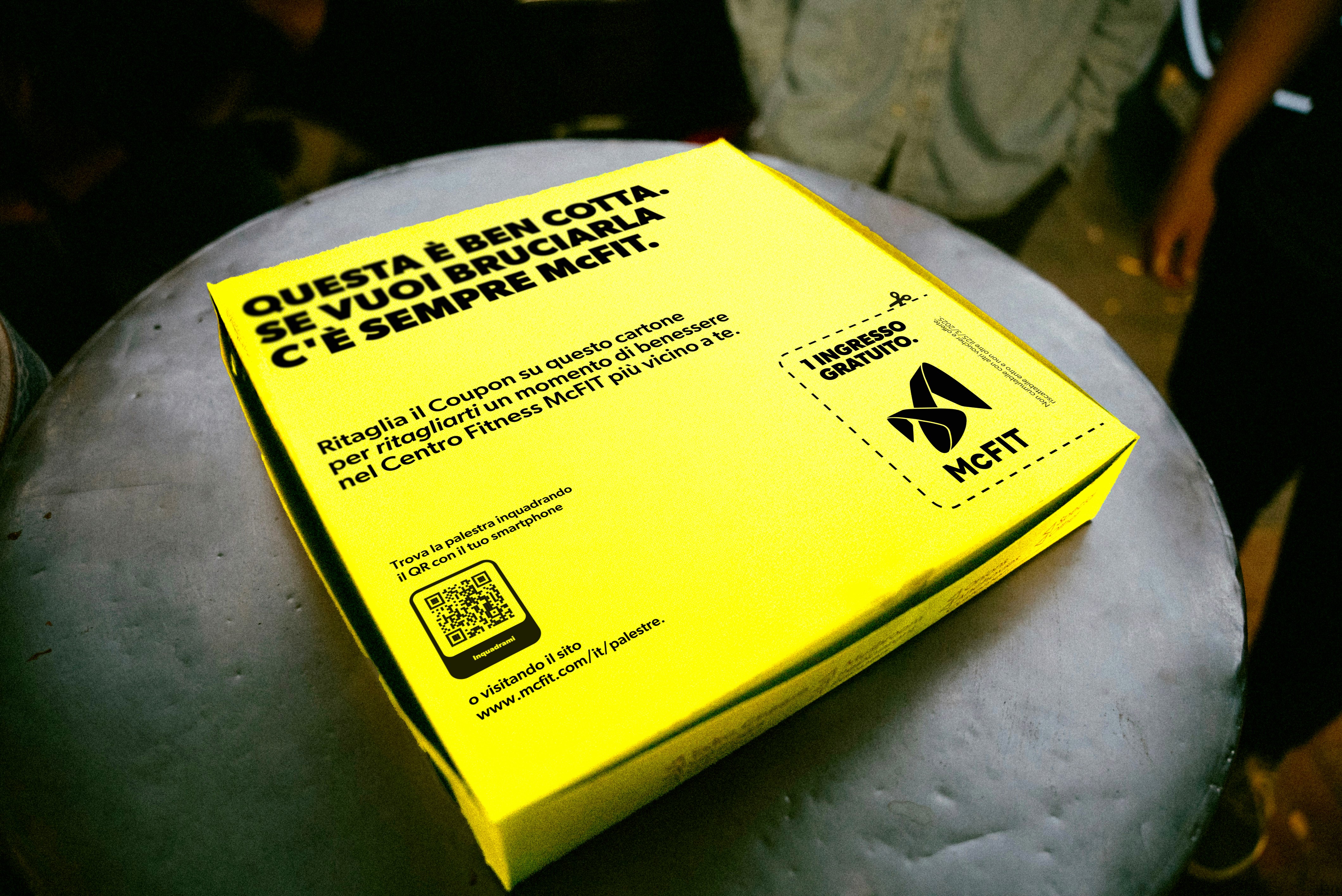 Qual è il momento in cui spesso ci viene in mente di iscriverci in palestra? Probabilmente subito dopo uno sgarro alimentare. E per molti italiani, lo sgarro per eccellenza è la pizza. Da qui l’idea: McFIT, la catena di palestre presente in tutta Italia, ha deciso di intercettare i suoi potenziali clienti proprio nel momento del cedimento. Come? Coinvolgendo 15 pizzerie entro un raggio di 3 km dalle sedi McFIT nelle principali città italiane. Abbiamo distribuito 15.000 cartoni per pizza con un messaggio speciale: "Goditi questo pasto, e se ti va, vieni a bruciarlo da noi".
